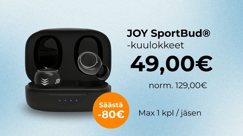 Legendaariset SportBud® -kuulokkeet ovat hikitiiviit ja tehdyt kovaan käyttöön. Sään- ja iskunkestävät kuulokkeet heijastavilla yksityiskohdilla. 100 % istuvuus ja jopa 25 h akunkesto. Etu max 1 kpl per jäsen. Ilmainen toimitus. Voimassa CityShopparilla 31.1.2026 asti. Lue lisää Joy-kuulokkeista