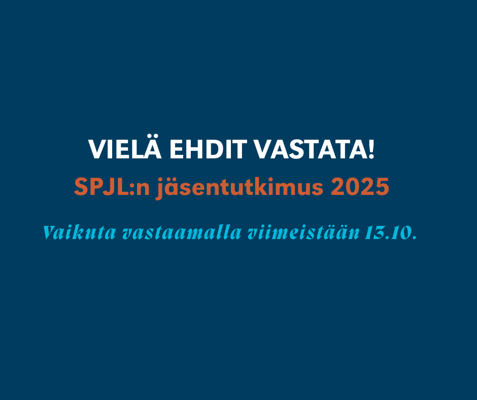 Joko olet sanonut painavan sanasi SPJL:n jäsentutkimuksessa? Lähetimme linkin jäsentutkimuslomakkeeseen sähköpostilla 29.9. Jos et ole saanut linkkiä, ota pikaisesti yhteys neuvottelupäällikkö Auno Mäkiseen, niin saat uuden linkin.